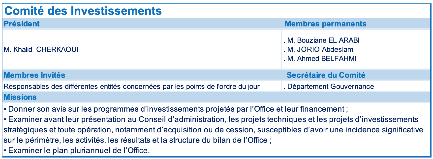 Les membres du Conseil d'Administration sont fixés par Dahir (composition de l'organe de gouvernance).