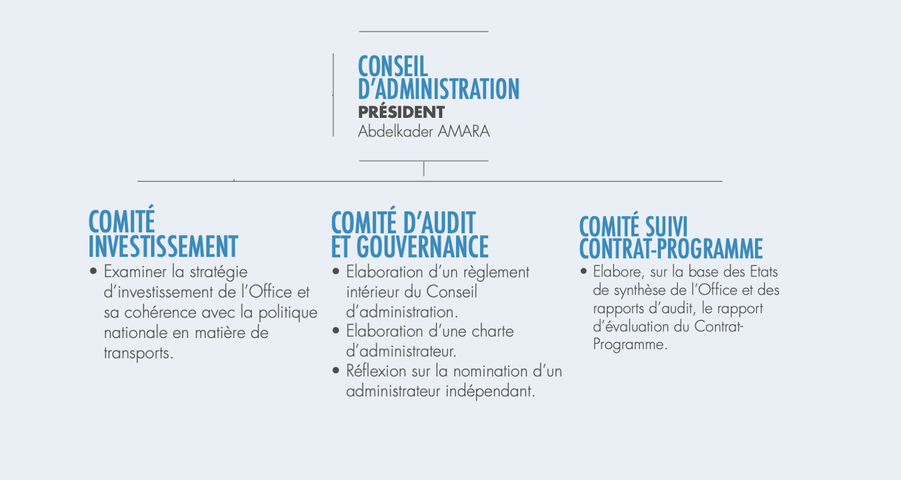 D’après l’article 3 du Dahir n°1-63-225 du 14 Rebia 1383 (5 août 1963) portant création de l’Office National des Chemins de Fer tel que complété et modifié, l’ONCF est administré par un Conseil d’Administration et géré par un Directeur Général. La composition ainsi que le rôle du Conseil d’Administration de l’ONCF sont régis par le Dahir précité.