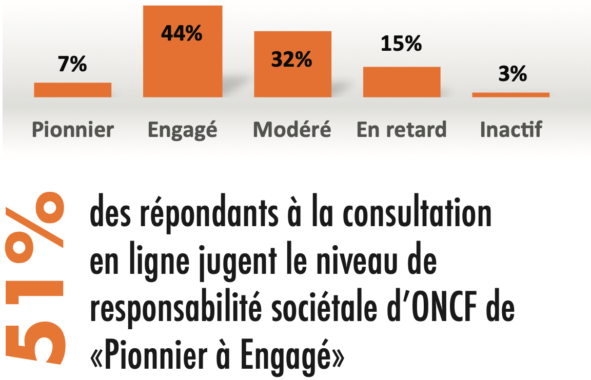 Une sélection de 30 enjeux a été faite par le Comité pour lancer la consultation en ligne. La priorisation des enjeux par les parties prenantes répondantes à l’enquête a permis de définir les 15 premiers enjeux présentés sur la matrice de matérialité. L'enquête auprès des parties prenantes a permis de faire remonter des commentaires. Ces remontées sont prises en compte dans le cadre du processus. L’ensemble de ces résultats intégreront progressivement le processus stratégique de l’ONCF.